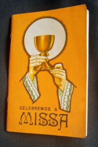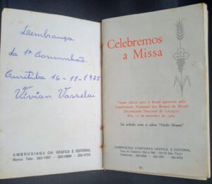 Em meio a uma arrumação em casa, Vívian reencontrou sua lembrança da Primeira Comunhão, um pequeno livrinho que era entregue às crianças da época. A lembrança remonta aos tempos do Padre Bruno, quando a igreja ainda estava em construção: “Fiz parte da primeira leva que recebeu a Primeira Comunhão na igreja nova, que nem estava bem acabada ainda. Só tinha o telhado, nem os vitrais estavam instalados. Nos invernos, era difícil aguentar o vento gelado que soprava sobre a gente”, recorda.