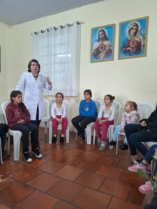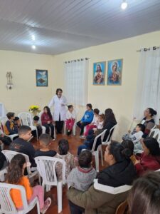 A Dra. Cláudia Regina Brandalize, pediatra e ministra da comunidade, conduziu uma palestra especial sobre a importância da higiene, trazendo orientações práticas e valiosas para o cuidado com a saúde infantil. Após a conversa, foram realizadas aferições de peso e medida das crianças presentes, e todas puderam desfrutar de um lanche preparado com carinho.