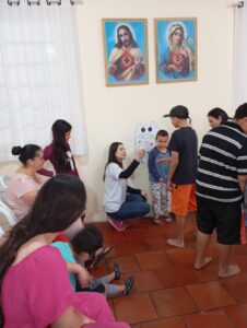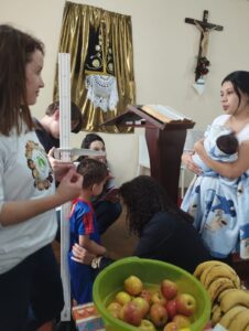 A manhã começou com uma celebração presidida pelo padre Marcos, reunindo famílias da comunidade em oração e partilha. Enquanto a Pastoral Social realizava a entrega de cestas básicas às famílias atendidas, a Pastoral da Criança promoveu um momento especial com as crianças.